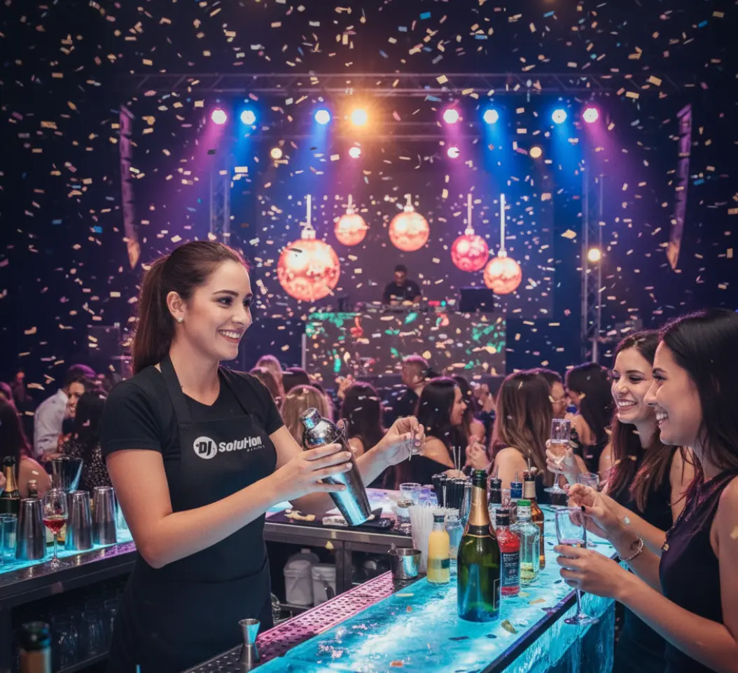 - ¿Fiesta de Integración Corporativa? El enfoque está en un DJ setup de vanguardia (Pioneer/Alpha Theta) y una iluminación dinámica.